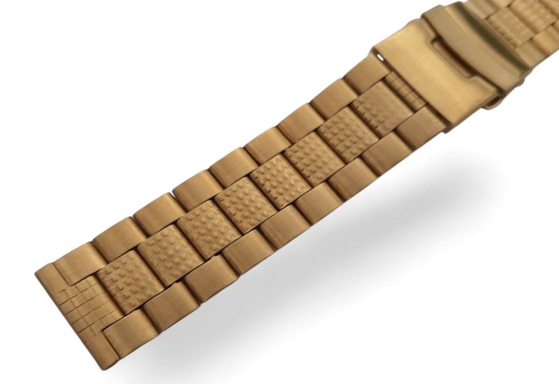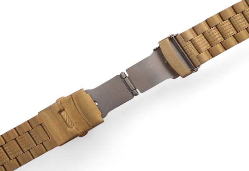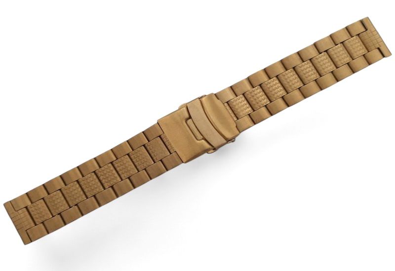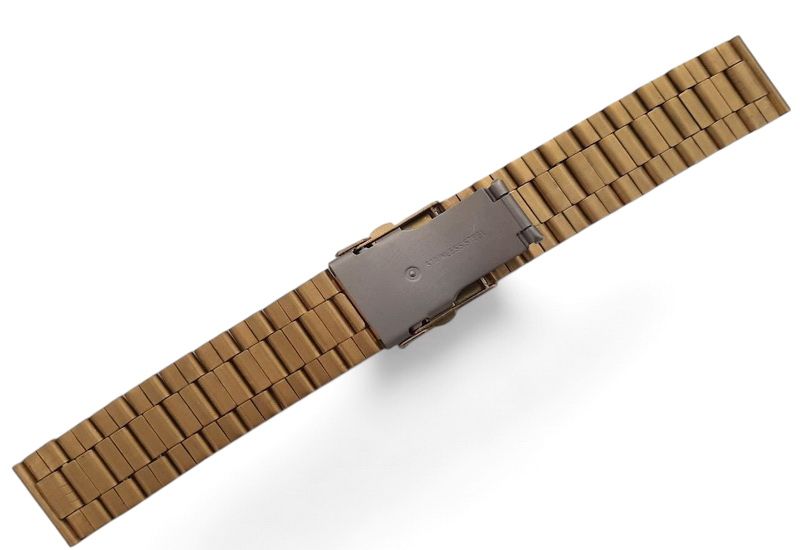 Браслет выполнен из нержавеющей стали с износостойким PVD–покрытием под золото. Конструкция браслета позволяет изменять длину благодаря съемным звеньям. При заказе обращайте внимание на способ крепления браслета к вашим часам и размер ширины браслета.