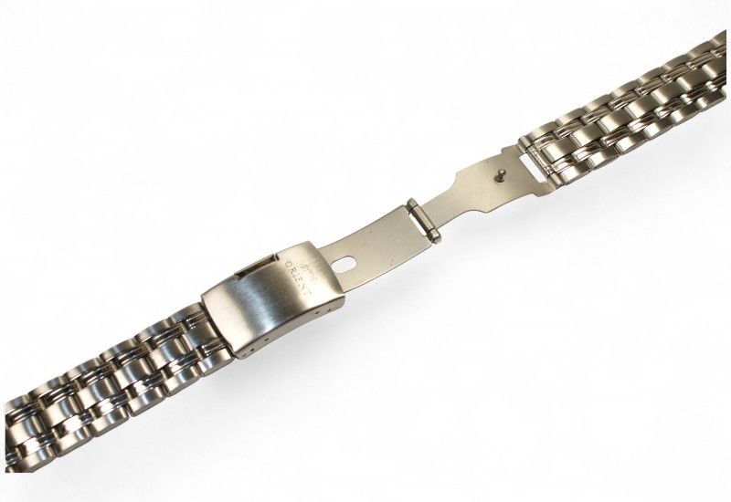 Металлический браслет длиной 185 мм предназначен для часов моделей Orient и оснащён автоматическим замком с боковой кнопкой для надёжной фиксации на запястье. Конструкция браслета позволяет легко регулировать длину с помощью съемных звеньев, обеспечивая идеальную посадку на любые запястья.
