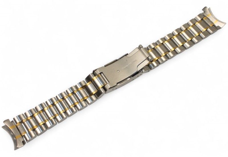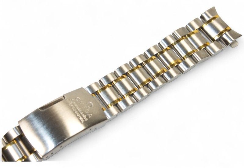 Стальной браслет для наручных часов Omega шириной 20 мм, комбинированным PVD‑покрытием желтого цвета и полукруглой вставкой.Надежный и стильный аксессуар, который подчеркнет элегантность ваших часов. Изготовлен из нержавеющей стали с литыми звеньями и удобным замком-автоматом с боковой кнопкой для надежной фиксации.