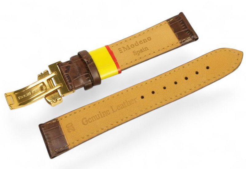 Кожаный ремешок Modeno Spain — практичный и стильный аксессуар для наручных часов, изготовленный из натуральной кожи высокого качества. Ремешки серии MODENO оснащены надежной стальной застежкой-клипсой (замок-бабочка) с износостойким покрытием, устойчивым к царапинам и ежедневному использованию.
