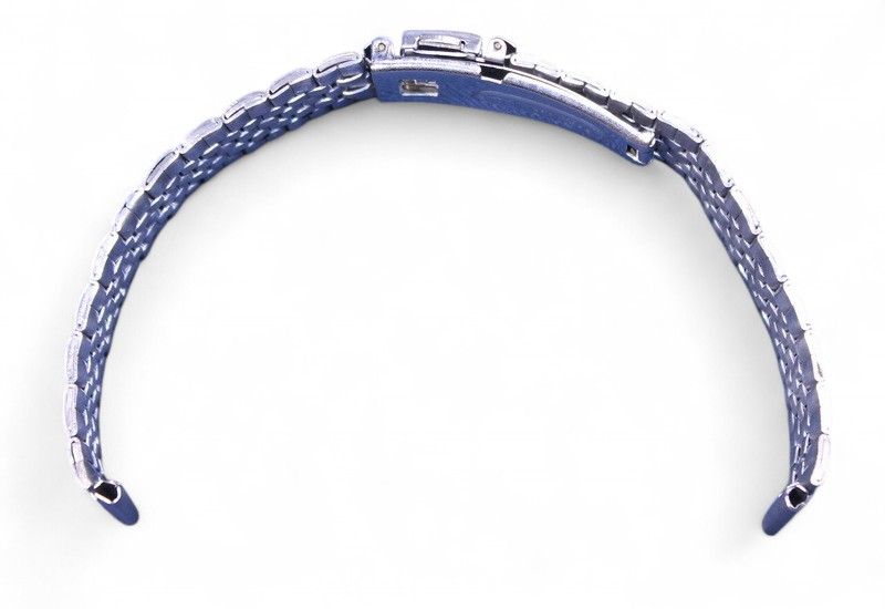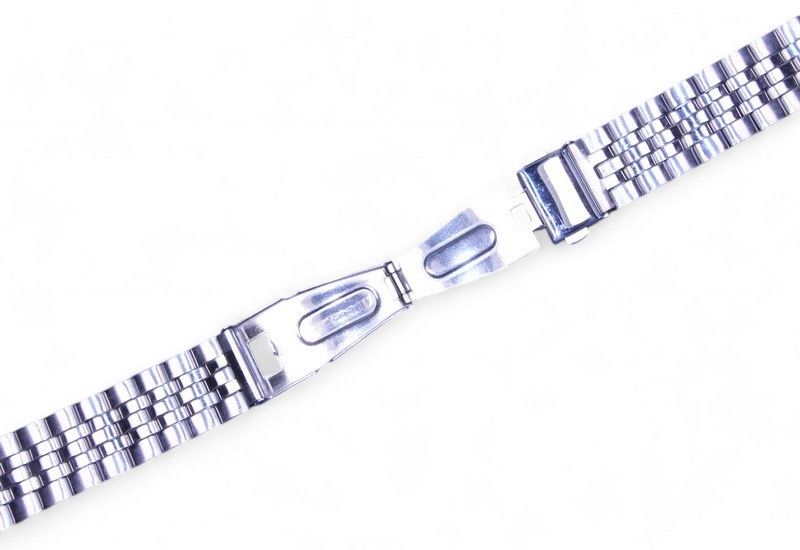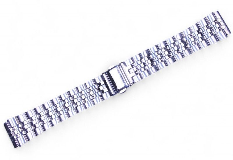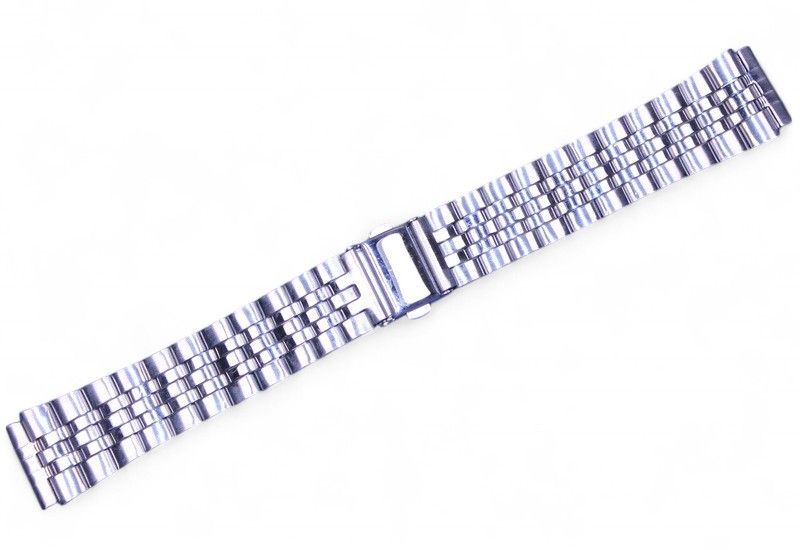 Универсальный металлический браслет серебристого цвета, изготовлен из нержавеющей стали. Оснащён замком с кнопочным фиксатором — простым и надёжным в повседневной эксплуатации.